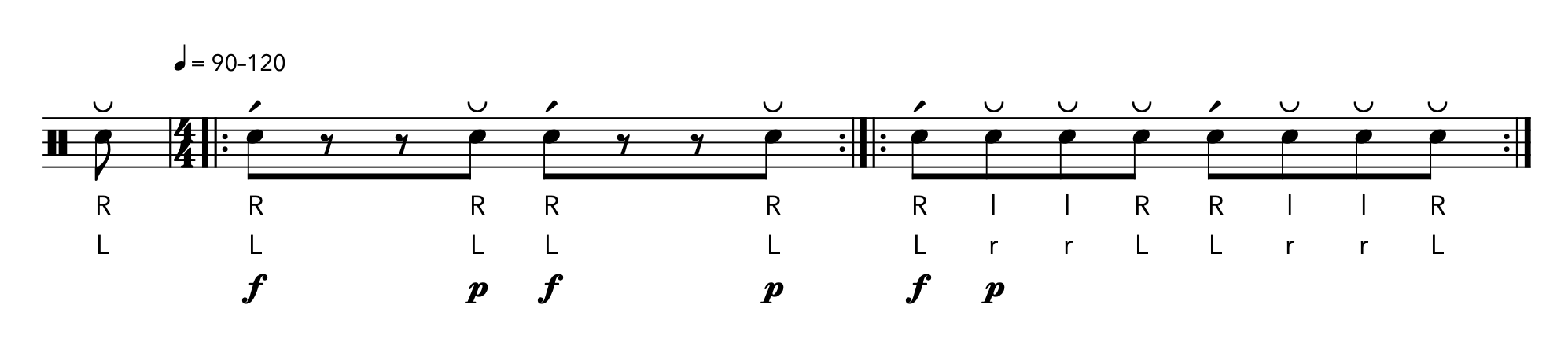 After a few minutes of isolating the inverted stroke, try it with both hands, using tighter rhythms to test if the stroke is durable at faster tempi. Really snap these out using your fingers!