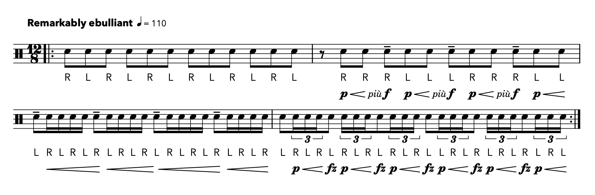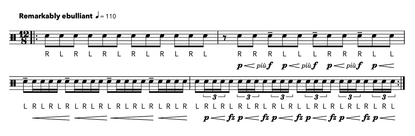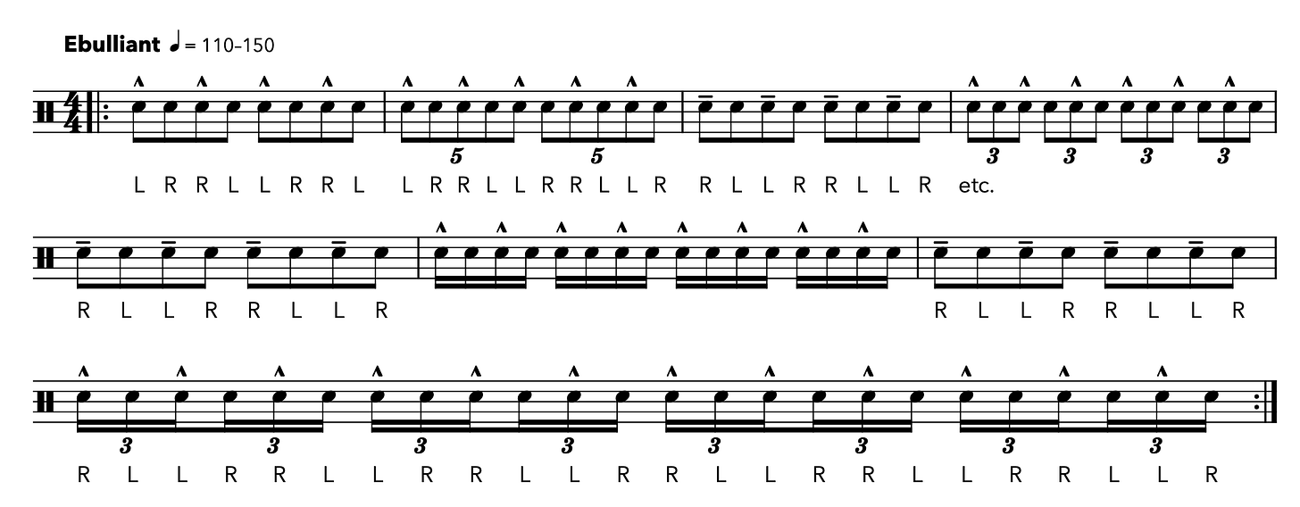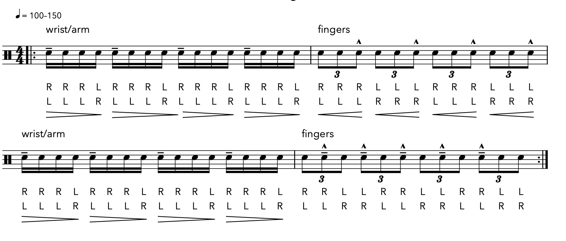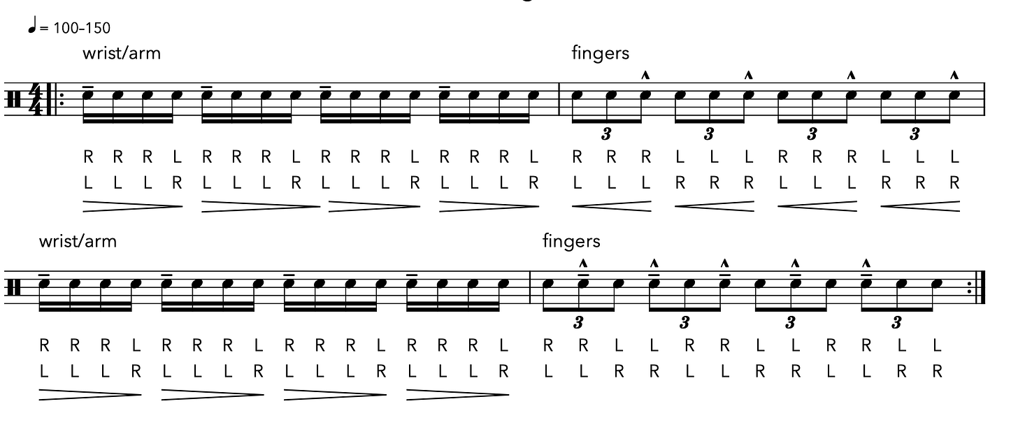 Check the exercise’s effectiveness by increasing the speed, turning the 16th notes into tuplets of increasing density, and keeping the metronome at the same setting.