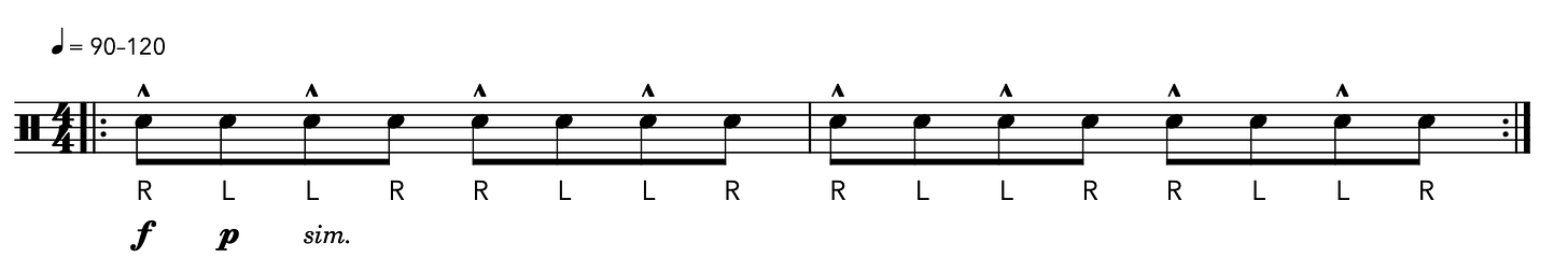 5-10 minutes on the first exercise is worth 20 minutes of practicing double strokes alone, so set a timer and get cracking.